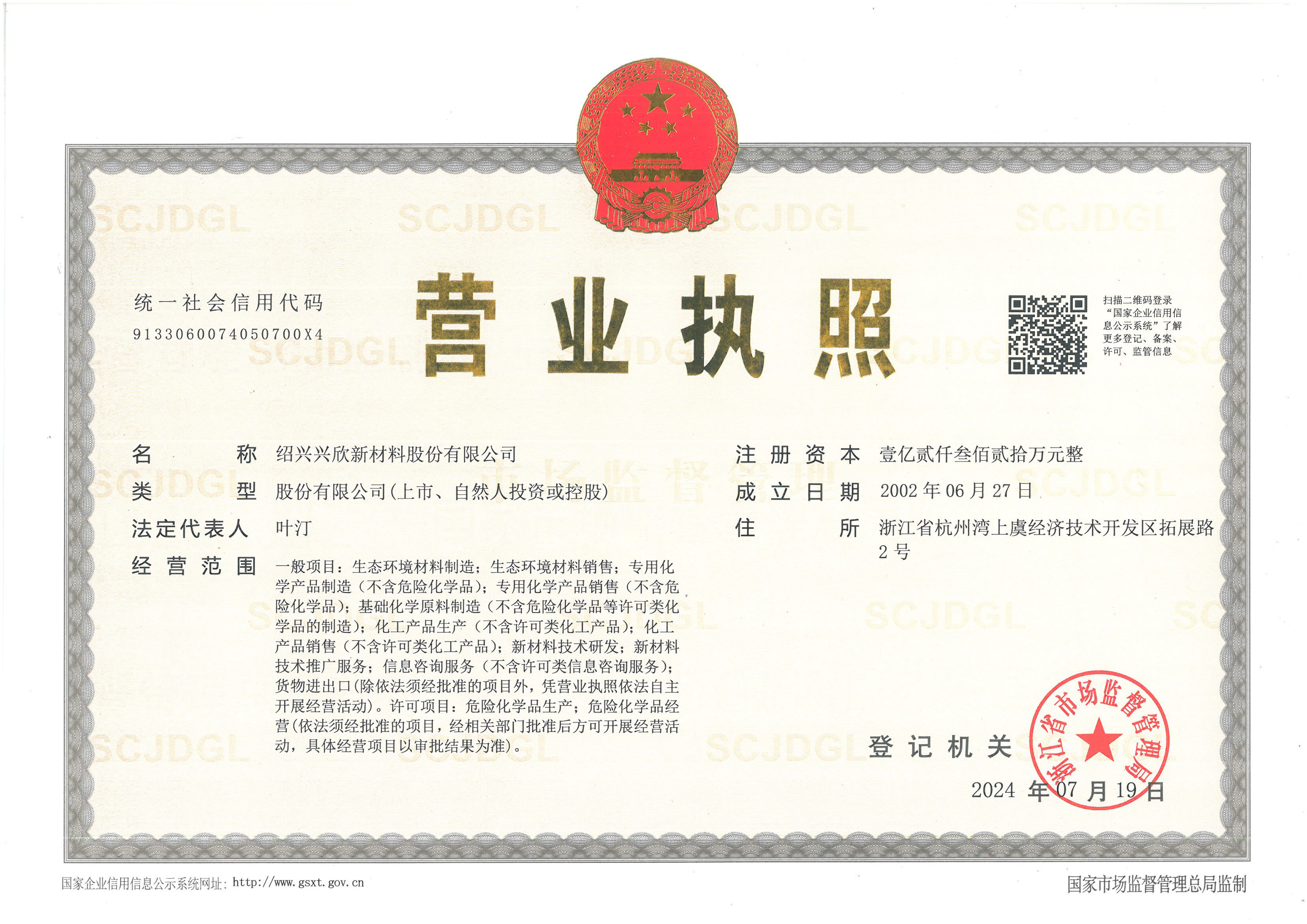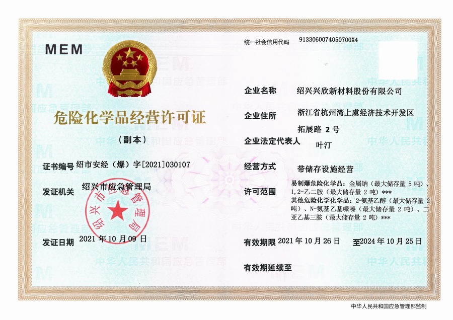 紹興興欣新材料股份有限公司成立于2002年06月27日,占地面積122畝,位于杭州灣上虞經(jīng)濟(jì)技術(shù)開發(fā)區(qū)拓展路2號(hào),現(xiàn)有職工200余人,專業(yè)技術(shù)人員50余人;博士、碩士研究生30余人組成的一支知識(shí)型、專業(yè)化的技術(shù)科研團(tuán)隊(duì)。公司面向全球市場(chǎng),專業(yè)開發(fā)電子化學(xué)品、環(huán)保化學(xué)品、醫(yī)藥中間體、高分子材料等先進(jìn)新材料重點(diǎn)領(lǐng)域的省級(jí)科技型企業(yè);建有浙江上虞、安徽東至兩個(gè)生產(chǎn)基地。目前為“國(guó)家高新技術(shù)企業(yè)”、浙江省“隱形冠軍”企業(yè)、浙江省專精特新中小企業(yè);建有“省級(jí)”研究開發(fā)中心,共建天津大學(xué)浙江紹興研究院電子化學(xué)品研發(fā)中心。